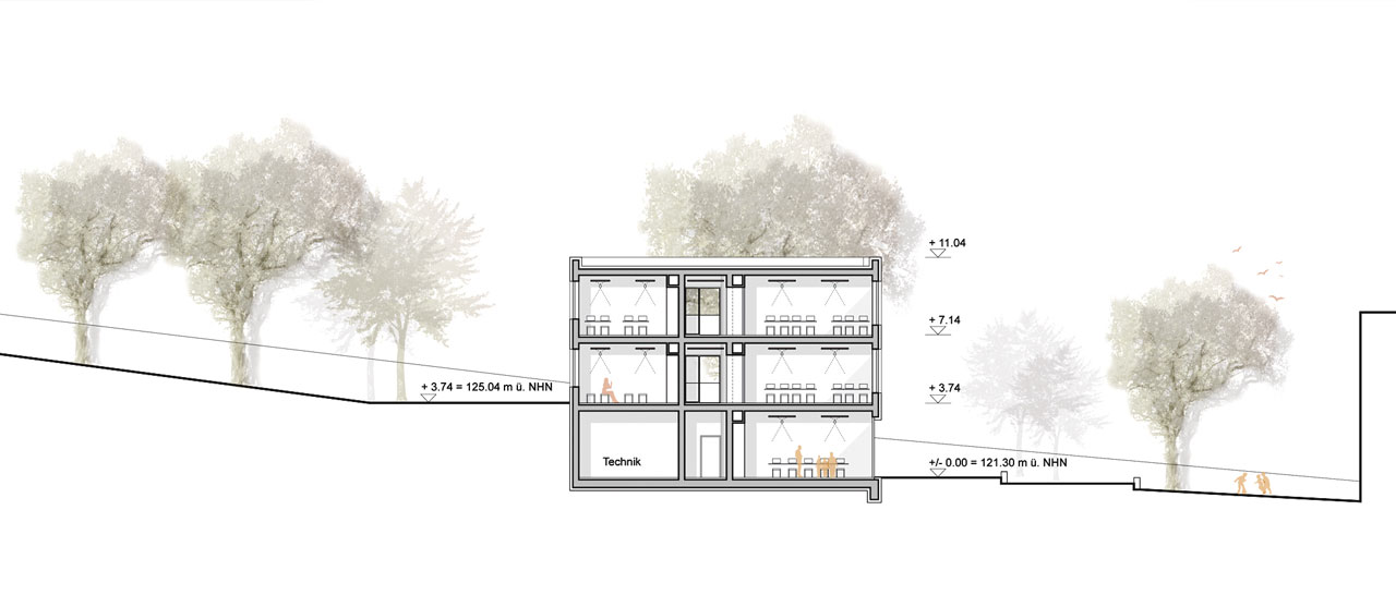 Der Entwurf sieht einen leicht abgewinkelten, an der nördlichen Hangkante positionierten Baukörper vor. Mittels der Gestaltung und Positionierung werden die vorhandenen Höhenlinien aufgenommen und Bezüge zur umgebenden Bebauung hergestellt.