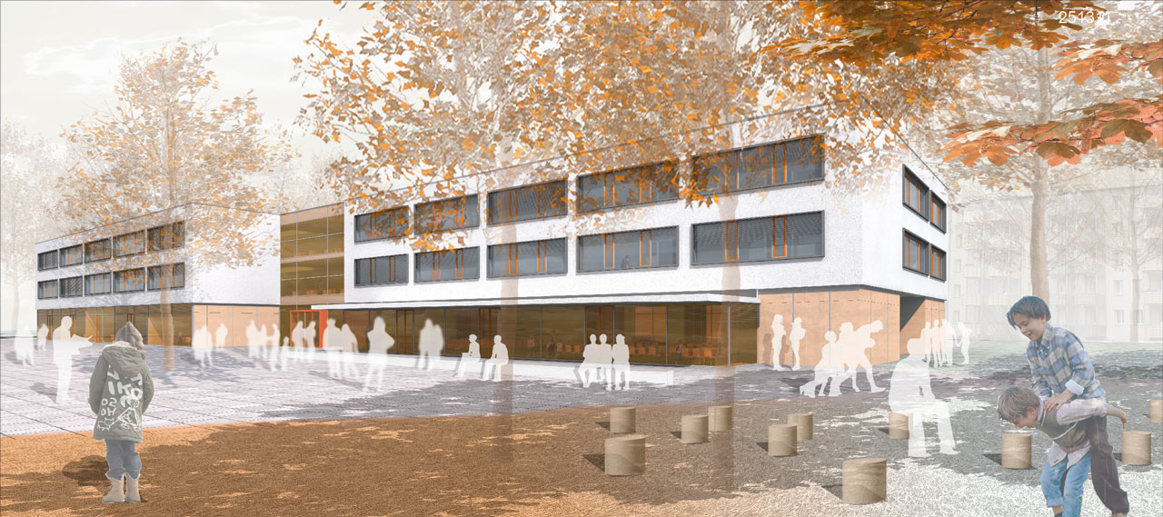 Mit dieser Komposition wird ein Vorplatzbereich im Norden und ein Pausen-, Sport- und Schulgartenbereich im südlichen Grundstücksbereich geschaffen. Die angestrebte offene und transparente Gebäudestruktur ist bereits im Bereich des Hauptzuganges erlebbar.