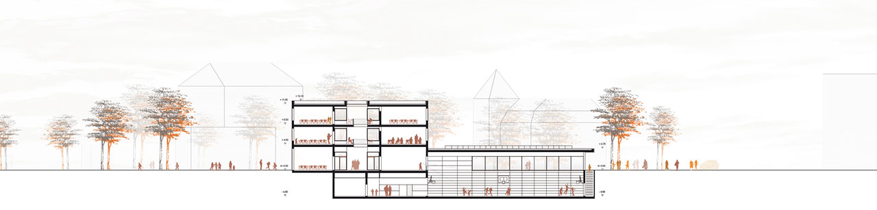 Mensa, Mehrzweck- sowie Musik- und Kunstraum als zentrale Begegnungsorte sind ebenerdig situiert. Schiebewände erlauben die Schaffung großzügig zu nutzender Flächen für besondere Veranstaltungen bzw. klassenübergreifende Aktivitäten.