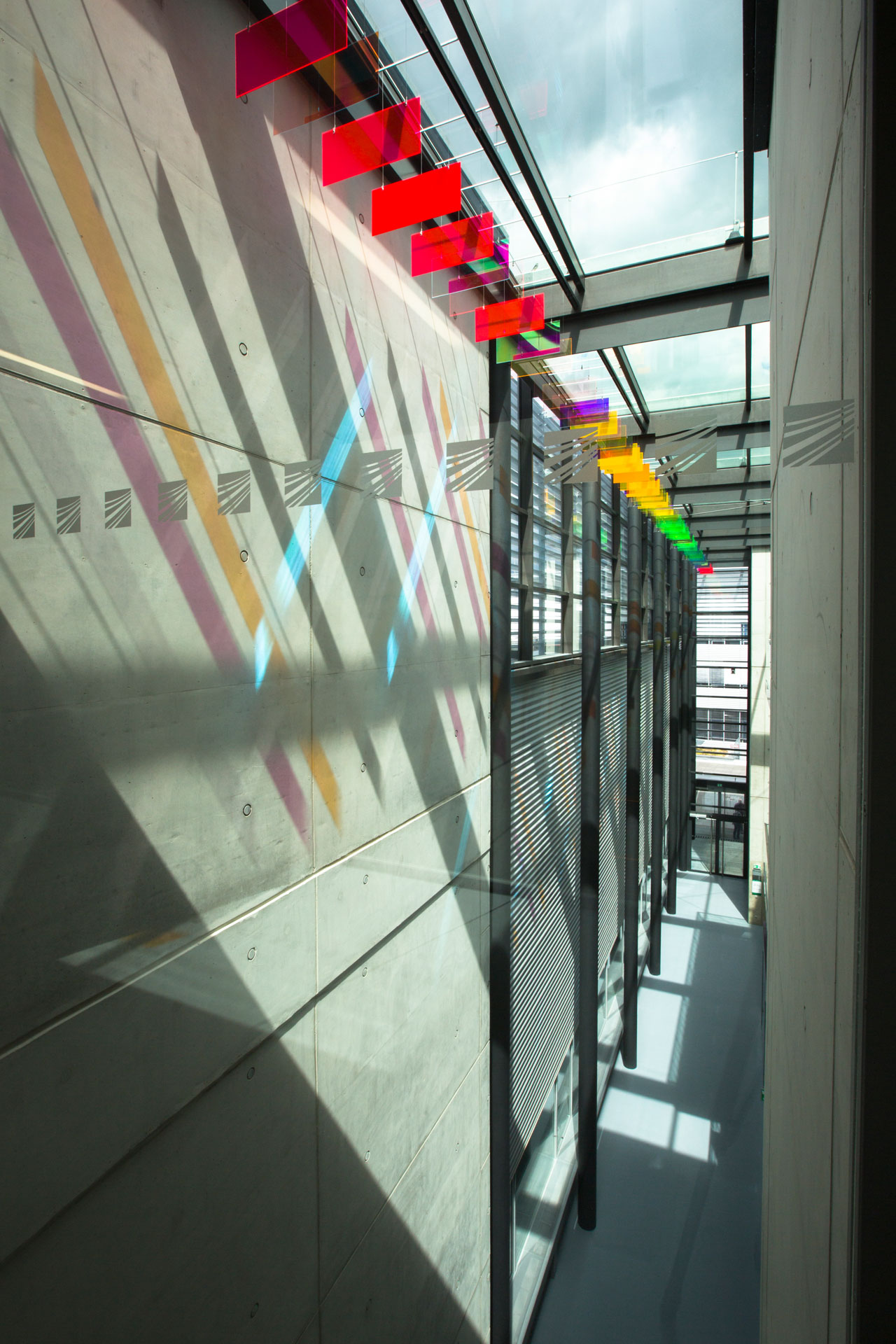 Die Reihung aus fluoreszierendem Plexiglas folgt dem Farbspektrum des sichtbaren Lichtes in Anlehnung an das Element Neon. Dazwischen angeordnet sind Flächen, die vermittels Multiplexbeschichtung ihre Farbigkeit je nach Betrachterstandpunkt im Spektrum des Regenbogens wechseln sowie die anderen Elemente spiegeln. Durch den Einfall des natürlichen Tageslichtes entstehen wechselnde Musterbildungen auf den Wänden.