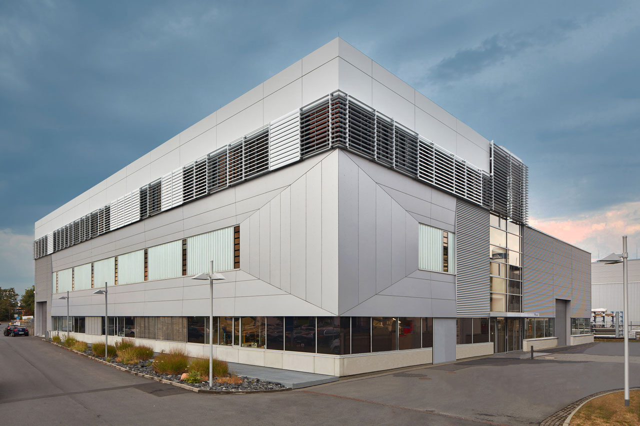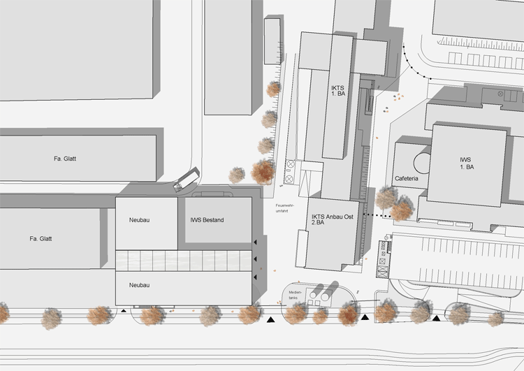 Ausgehend von der geringen zur Verfügung stehenden Baugrundstücksfläche, der Forderung der Integration der bestehenden Technologiehalle IWS sowie der zu realisierenden Raumtypologien wurde ein L-förmiger, 2-geschossiger Baukörper konzipiert.