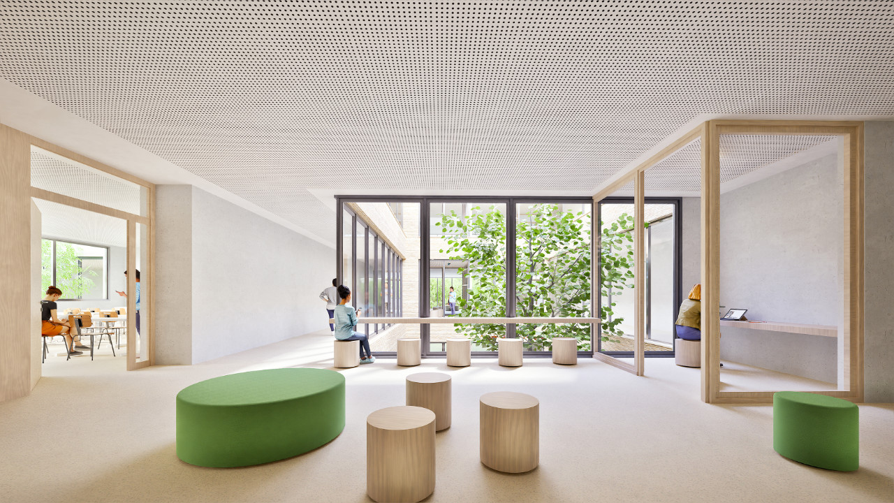 Das Gebäude fügt sich durch seine klare städtebauliche Setzung auf dem Grundstück gut in die nähere Umgebung ein. Durch die Gliederung der einzelnen Baukörper und die Abwechslung von Clusterhäusern mit dazwischenliegenden nach Süden orientierten Höfen, reagiert der Neubau auf die Maßstäblichkeit seiner Umgebungsbebauung. Die einzelnen Clusterhäuser und die Sporthalle sind ablesbar durch versetzte Verbinder miteinander verknüpft, wodurch sich der gesamte Baukörper gliedert. Zwischen den einzelnen Clusterhäusern werden Plätze gebildet, die unterschiedliche Freiräume definieren (Vorplatz, Aula/Mensa-Hof mit Freiterrasse) und einen fließenden Übergang zwischen Außen- und Innenraum gestalten.