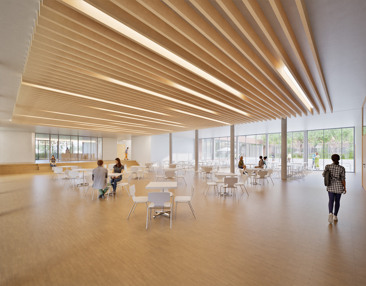 Der zentral im Erdgeschoss verortete Mensa- und Aula-Bereich mit mobilen Trennwänden sowie dem dazugehörigen, ebenerdig erschließbaren Außenbereich mit Freiterrasse, ermöglicht unterschiedliche Nutzungen und kann an die aktuellen Bedürfnisse durch verschiedene Raumzuschnitte angepasst werden. Der direkt am Wirtschaftshof gelegene Küchenbereich lässt aufgrund seiner Lage und Ausstattung eine Vielzahl an Varianten der Mittagsversorgungen zu, z.B. Ausgabeküche mit Frischeanteilen, „Cook and Chill“ oder eine reine Ausgabe. Der Ausgabe ist ein Freeflow-Bereich vorgelagert.