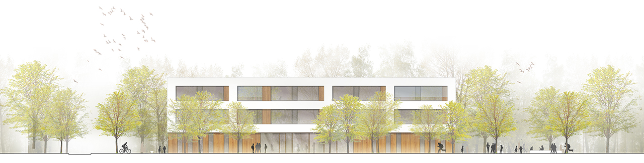 Dem Ziel eines kompakten Baukörpers folgend, wurde die Sporthalle in das Gebäude integriert und gewährleistet so eine schnelle Anbindung der Räumlichkeiten für den Sportunterricht.