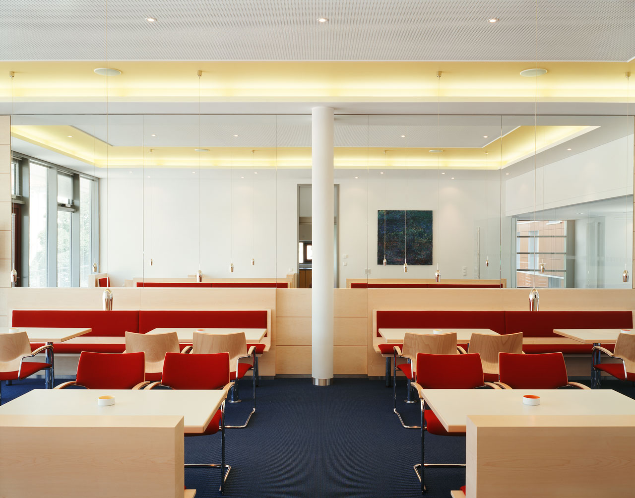 Schlicht und zurückhaltend wurden der Besprechungsraum sowie die Cafeteria gestaltet, sodass die Wirkung der roten Sitzbezüge intensiviert wird.