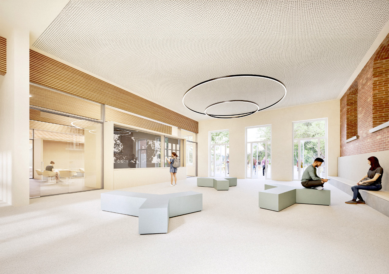 Ein großzügig gestalteter, neu angelegter Eingangsbereich zwischen Haus A und B verbindet die Außenanlagen mit dem Innenraum der Schule und schafft einen fließenden Übergang, der der Funktion als zentraler Anlaufpunkt gerecht wird.