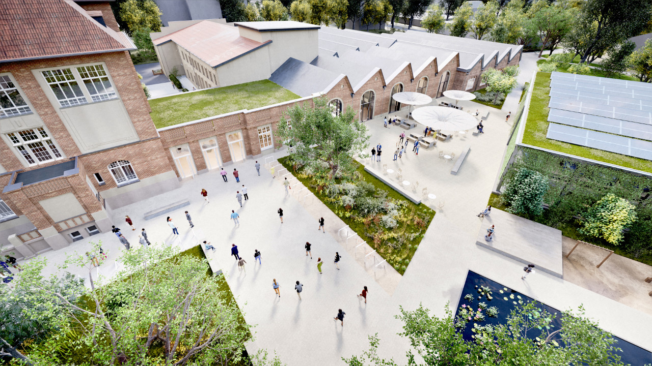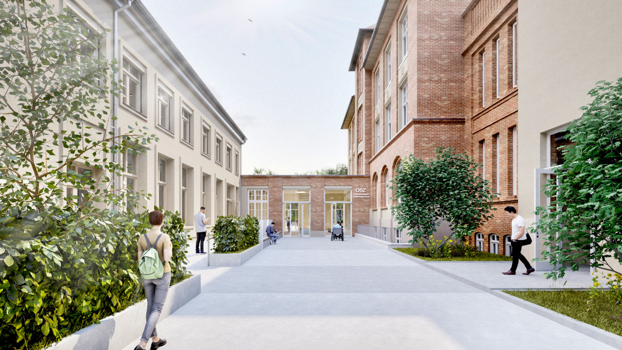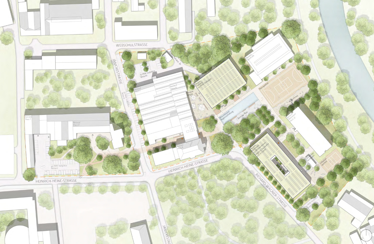 Die Entwicklung eines Schulcampus, der das ganztägige Leben und Lernen in der Gemeinschaft ermöglicht, steht im Zentrum des städtebaulichen Konzepts. Das Entwurfskonzept basiert auf den bestehenden städtebaulichen Strukturen. Die neuen Baukörper werden sorgfältig in die vorgefundene Konfiguration eingeordnet. Das bauliche Erbe bleibt sicht- und erlebbar, während durch die neuen Elemente optimale Rahmenbedingungen für die schulische und außerschulische Nutzung geschaffen werden.