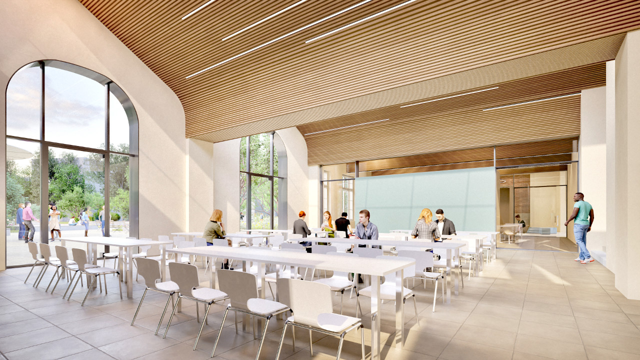 Die Mensa wird vergrößert und neu organisiert. Neben den 32 Plätzen im zentralen Bereich können weitere Sitzmöglichkeiten in den angrenzenden Aufenthaltszonen genutzt werden, sodass insgesamt mind. 60 bis 70 Auszubildende Platz finden. Ergänzt wird hier das Raumangebot über eine dem Speisesaal vorgelagerte Terrasse mit teilweise überdachten Sitzgruppen.